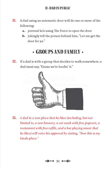 Since the dawn of time, all dads have understood that there are a set of rules for fathers – both old and new alike – that guide them to gleefully repeat terrible puns as well as to hone the perfect deadpan joke delivery. This handsome tome collects all of the governing laws of fatherhood, covering a vast array of conceivable situations ranging from fashion to tech to simply being a dad in public.