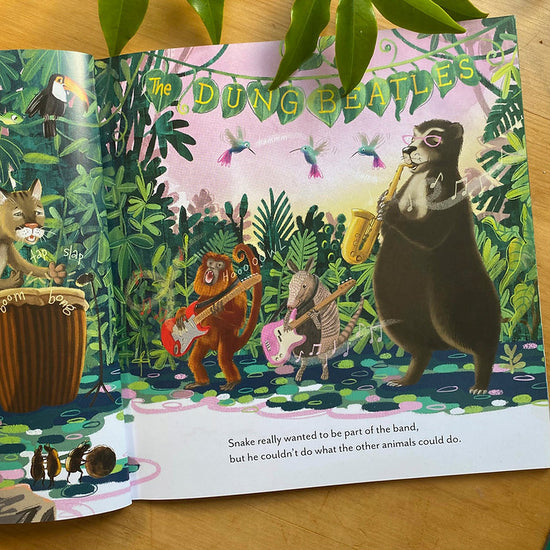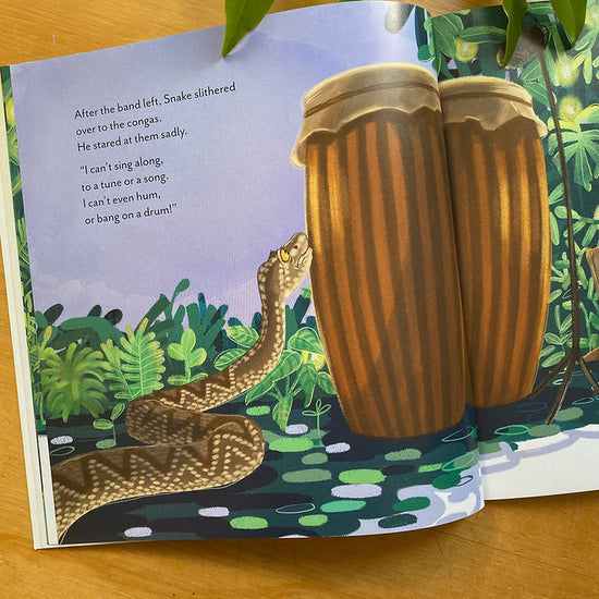 Jazz sounds drift through the trees deep in the South American jungle. Creatures wriggle, shake and swing to the beat of the drums. Snake really wants to be part of the band but he has no thumbs to thrum or strum. He can't even hum or bang on a drum! Snake tires of watching The Dung Beatles having fun every evening, jazzing and jiving and having a ball, so he decides to do something about it.