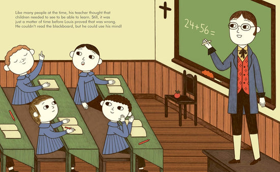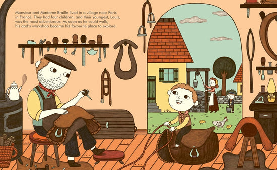 Little People, BIG DREAMS Louis Braille explores the life of the remarkable man behind Braille, the tactile reading and writing system. Little Louis was a curious child – always exploring and having adventures. Then one day, while playing in his father's workshop, he had an accident with a tool and eventually lost sight in both eyes. It was tricky to get used to, but with help from his family and a local teacher, Louis continued to learn and explore.