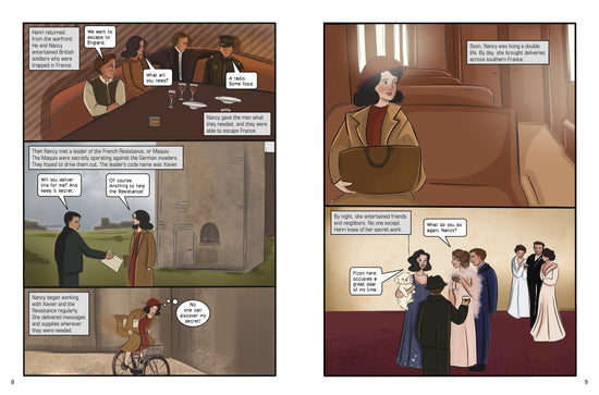 A brave Kiwi (born in Roseneath, Wellington) named Nancy Wake became one of the movement's greatest assets as a spy. In her role, Wake often transported Jews to safe locations and rode her bicycle through German checkpoints to deliver messages and supplies. For her ability to avoid capture, the enemy nicknamed her the "White Mouse." In this full-color graphic novel, discover more about this fearless woman who faced the enemies of World War II.